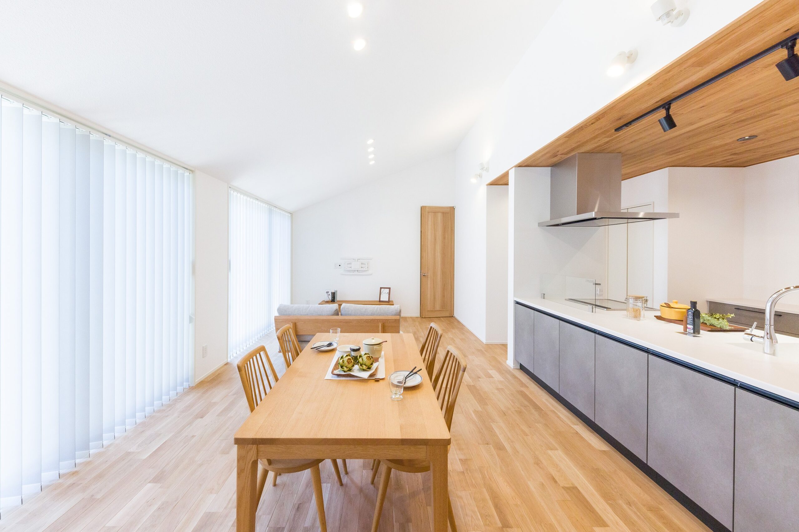 リビングにビルトインガレージの上の空間を有効活用し、スキップフロアを導入しました。この巧妙なデザインにより、玄関からリビングに足を踏み入れた瞬間、視線が開け、16帖以上の広がりを感じることができます。床には質の高いムク材が使用され、勾配天井には丁寧に施された羽目板が木の温もりを演出して心地の良いあたたかな空間が広がっています。外観においては、片流れの屋根と木格子の組み合わせが全体のバランスを引き締め、洗練された和モダンな雰囲気を演出。そして最大の特徴は、無駄のないコンパクトデザインにあります。機能的かつ美しいデザインが見事に融合し、高い住宅性能が実現されました。