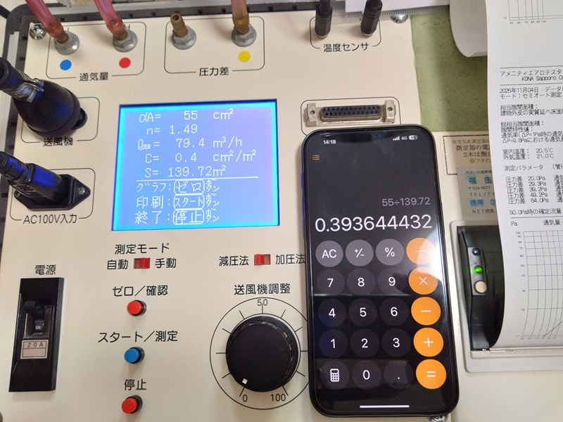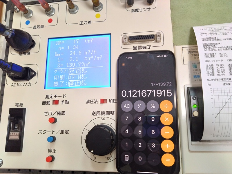 木花家では必ず中間気密測定と完成気密測定と2回測定を行います