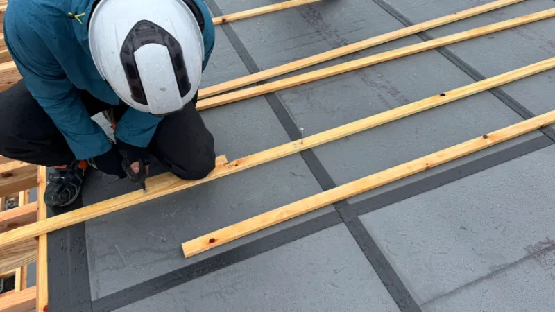 断熱材の上に、通気胴縁(細い木材)を打ちその上に、野地板を張ります