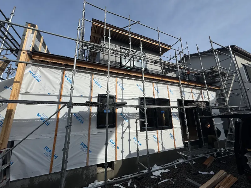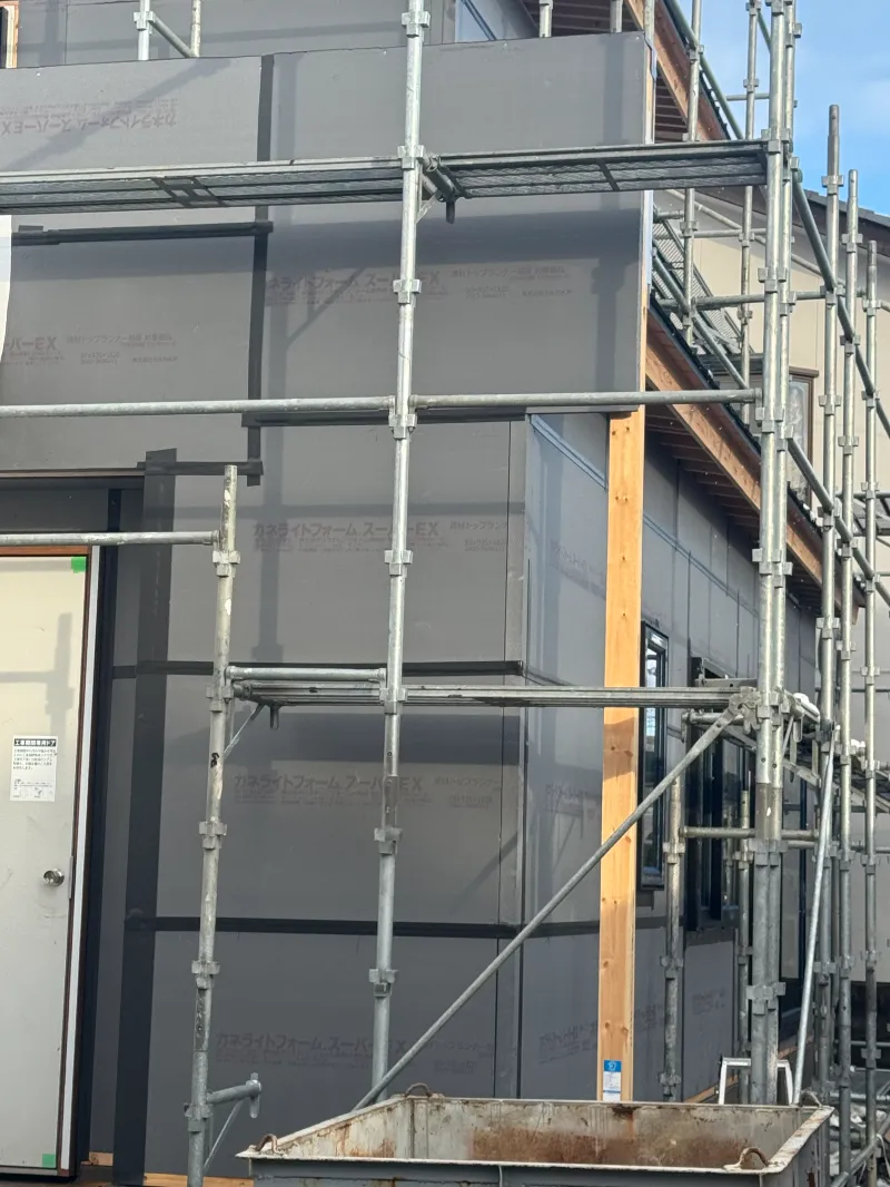 基礎の外側、柱の外側、屋根の上と家全体をまるごと包み込む為、