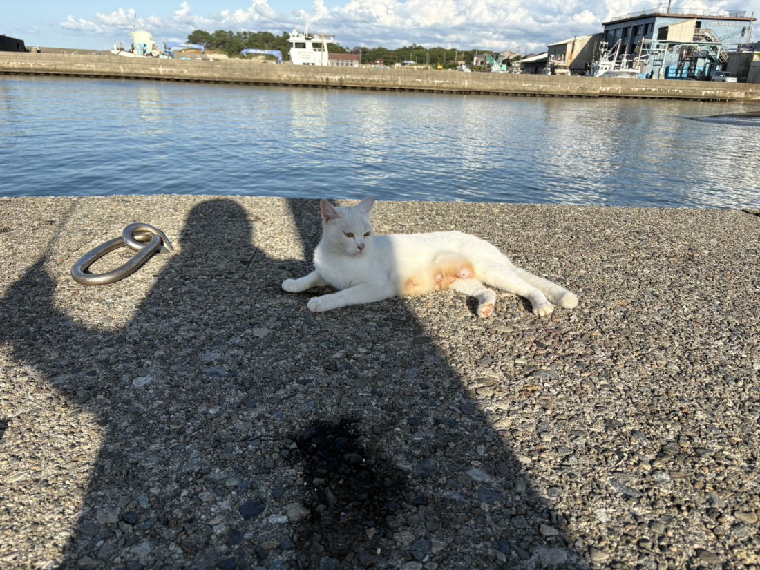別の釣り場にて。にゃんこがいました。ゆっくり近づいてきて全く警戒心もないような感じでした。ただ、サビキで釣れた瞬間立ち上がってきて横取りされました。2回も。マッマだったのでキッズ達に与えていたのかーって思いました。可愛かったのでなんでもよかったです。