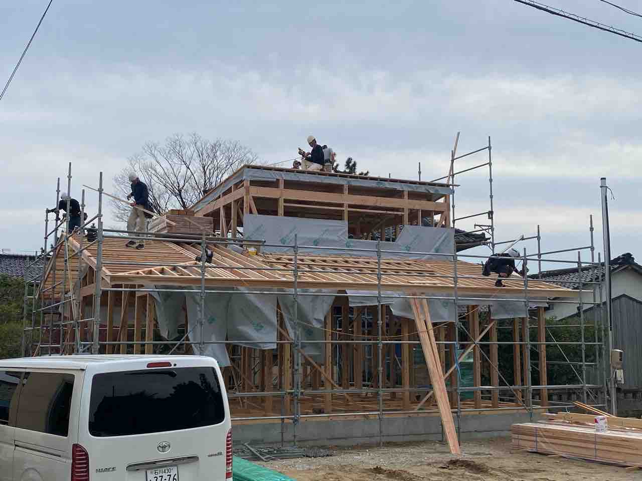 1階の屋根垂木まで打ち終わり、広小舞を打っていますね。