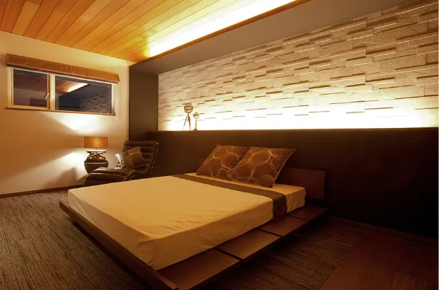 枕元の壁面に石目や木材など質感のある素材を用いると、印象がワンランクアップ。