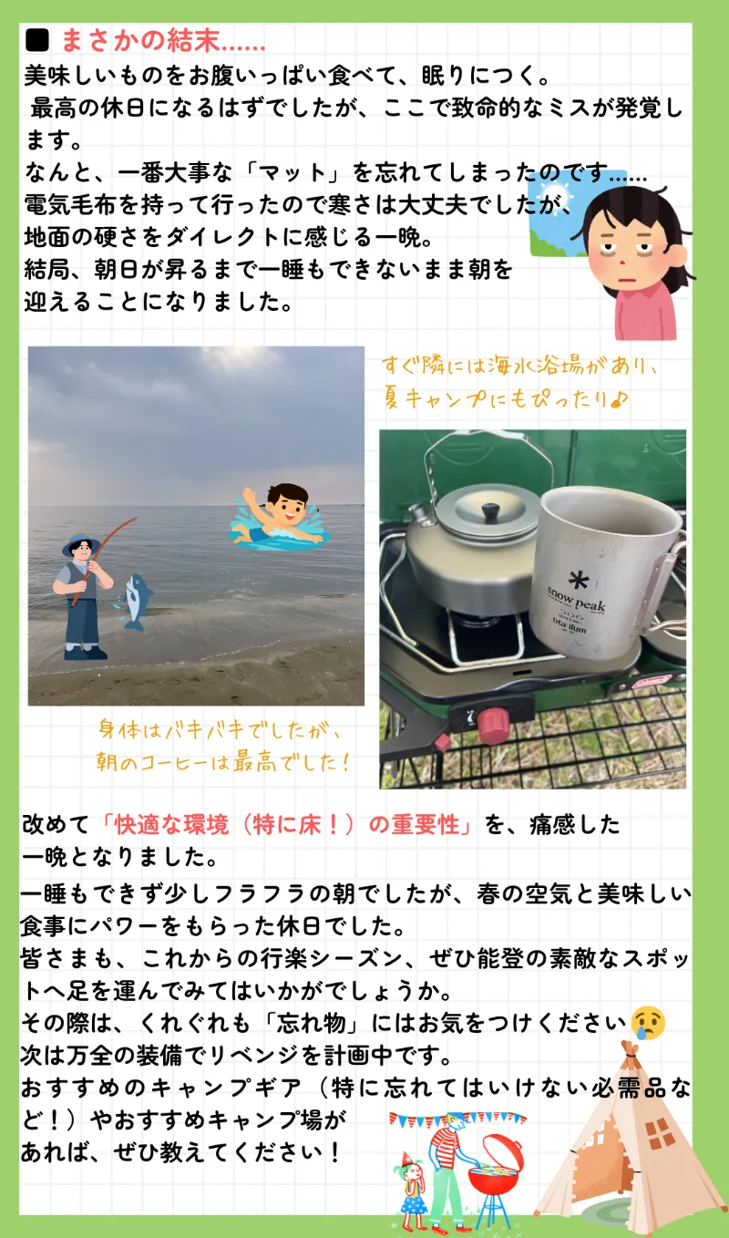 スタッフブログvol.71【能登キャンプ!快眠を奪った「まさかの忘れ物」】
