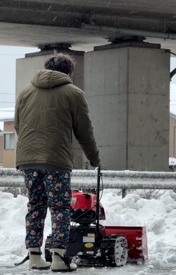 雪かき後の後ろ姿、ダウンの着方とマフラーの被り方が相まってヒーローみたいでかっこよかったです☆