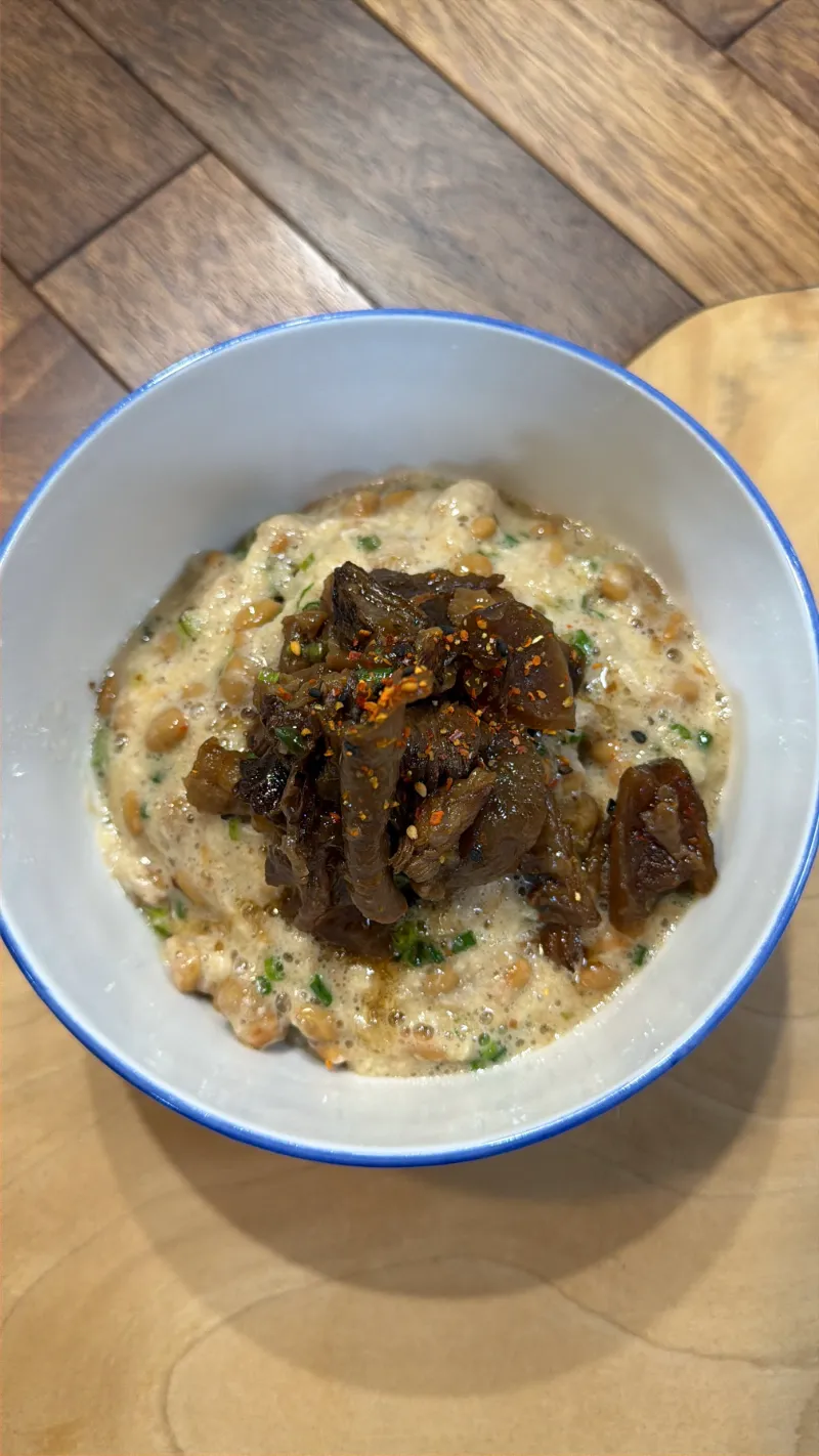 納豆、とろろ、小松菜、牛スジ煮込み丼!
