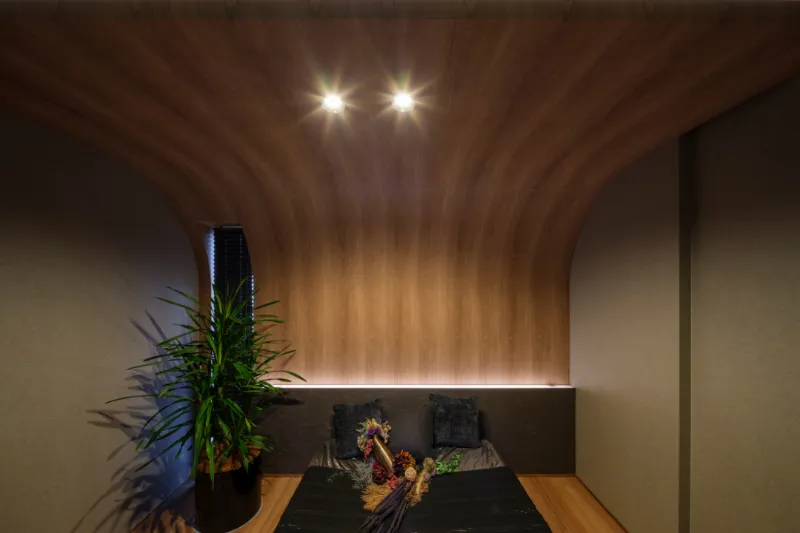 モールテックス×格子×木の異なる素材が織りなす洗練された空間