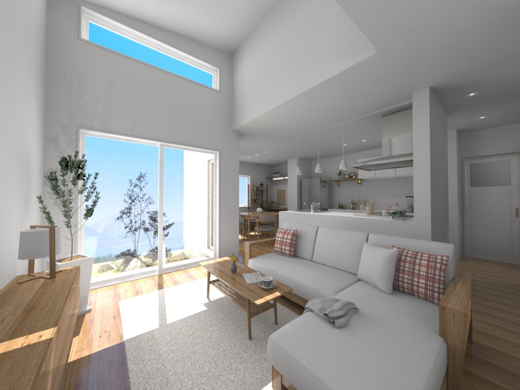 リビングの一角には、勾配のある高天井と高窓を計画。