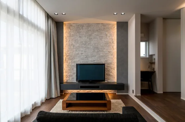 お施主様こだわりの天然石を施工したTVステーション。 迫力あるグレーの石が存在感を示します。
