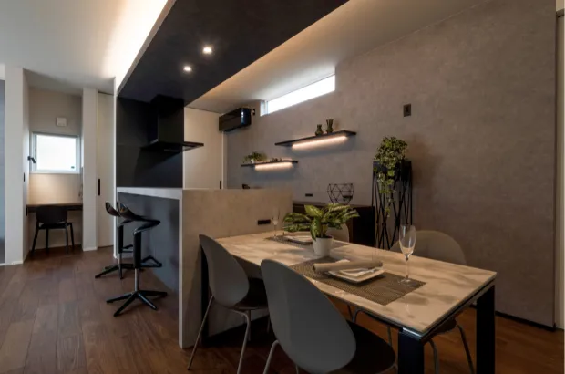 フロアタイル敷きのモダンなリビング。 通常より30cm高いグランドリビングと、コーブ照明が空間を広々と演出します。