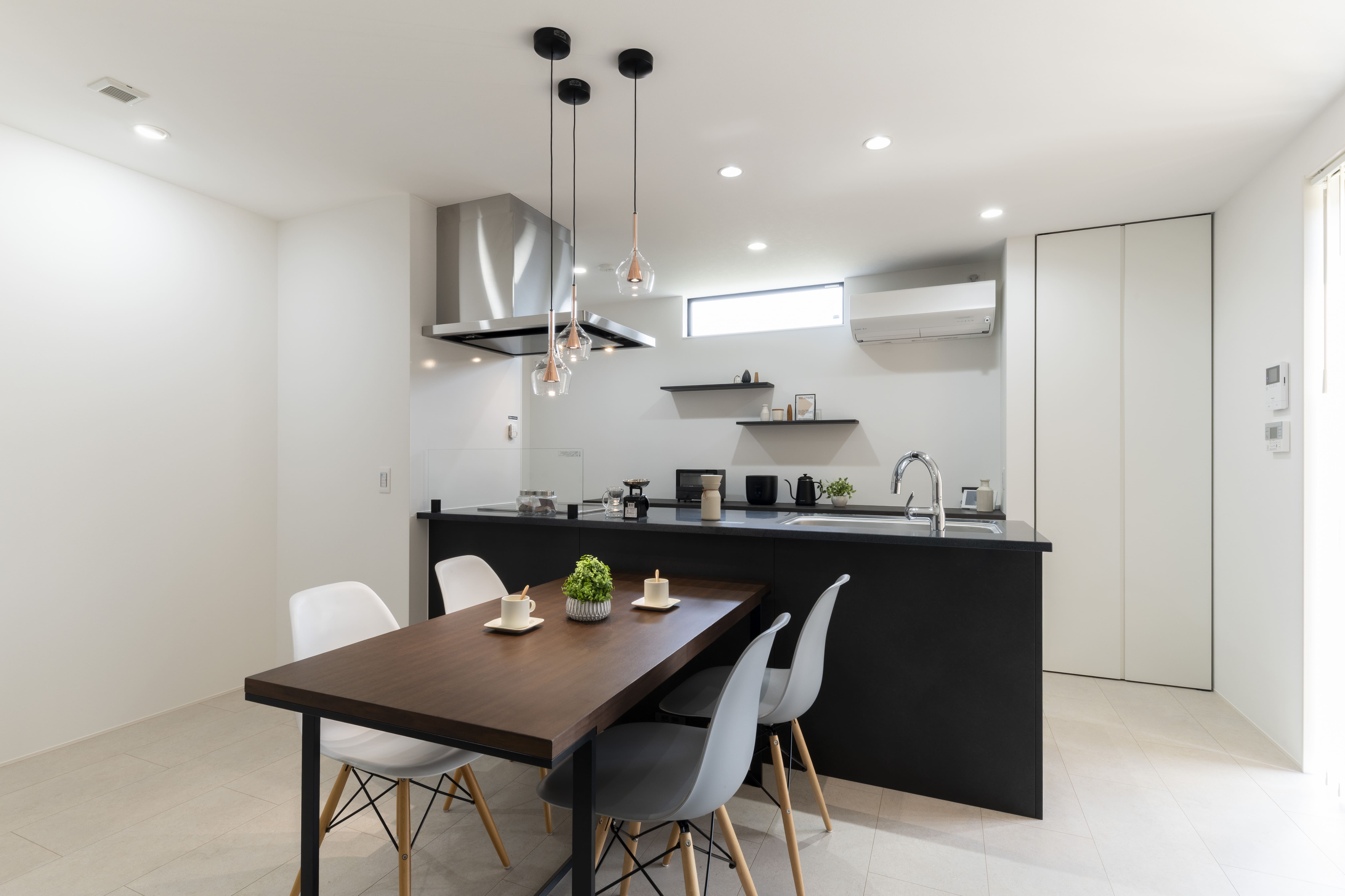 造作のダイニングテーブルはキッチンとの一体感ある人気の配置。