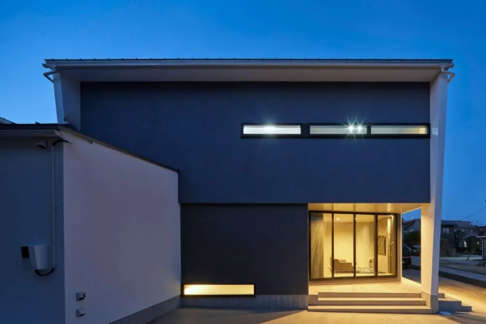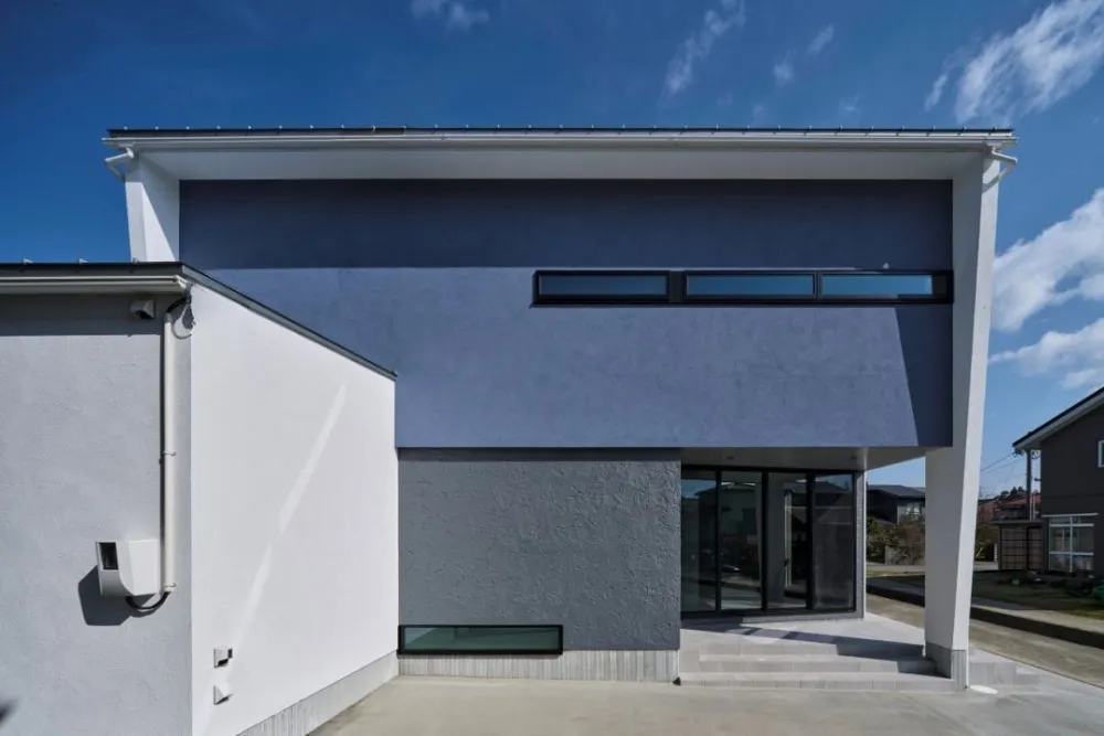 2階が張り出した立体的な外観