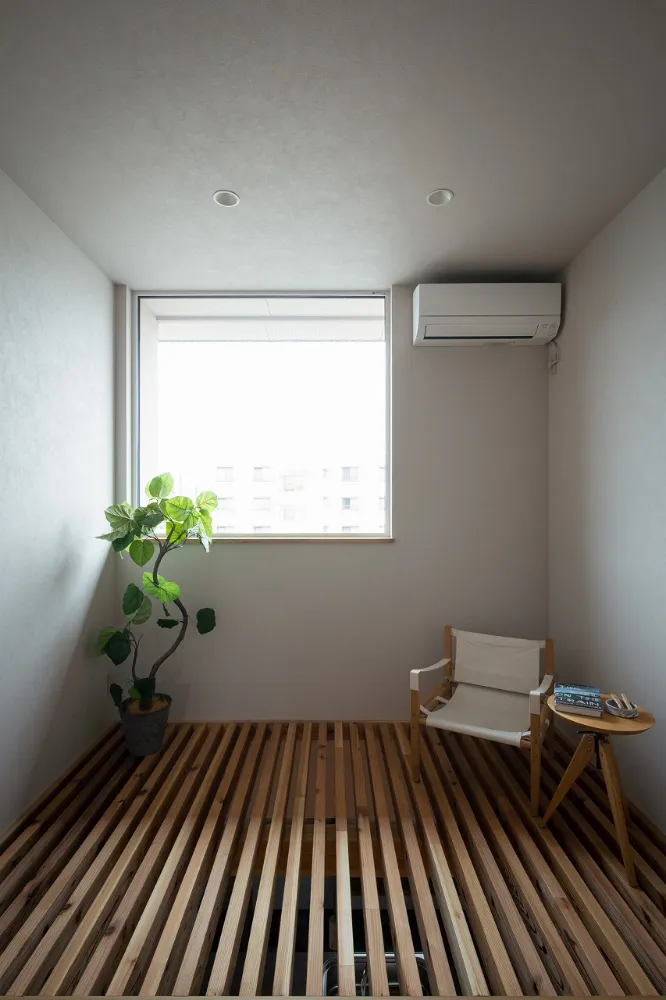 吹き抜け上部には、人が乗っても安心な強度を持たせた格子床を設けました。 単なる上下階のつながりではなく、腰掛けたり、物を干したり、気分転換に立ち寄ったりと、暮らしの中で自由に使える“余白”として計画しています。 中二階的なこの場所があることで、家の中にささやかな楽しさと、視線の変化が生まれています。