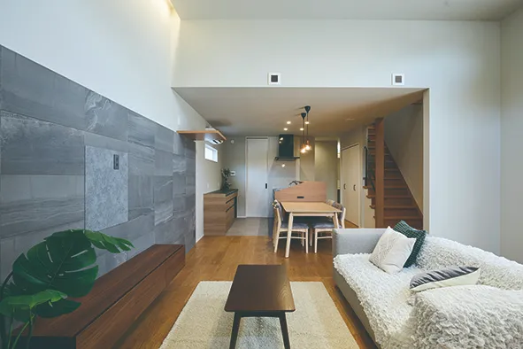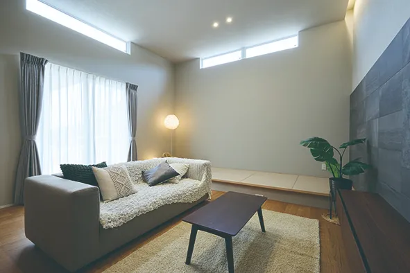 3.5mのこだわりの高天井。吹抜けほど高くなくゆったりと感じ、かつ落ち着く程度の高さに設定。リビング横には子供の遊びスペースなどのためにフリースペースを作った。