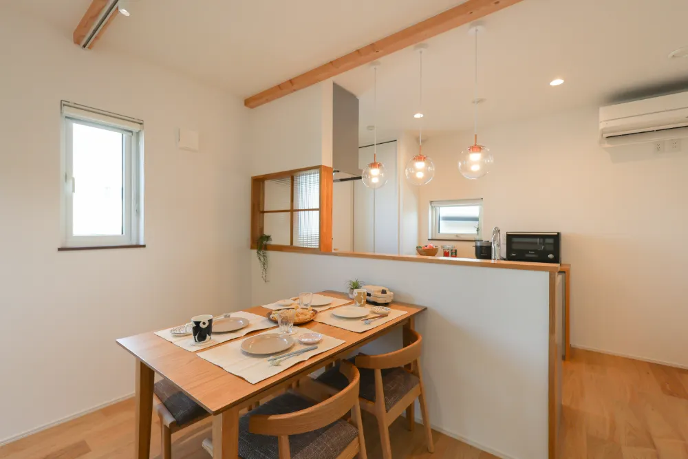 ナチュラルな内装に、天井を彩る3本の木のデザインが温もりを添える住まい。ダイニングには印象的なペンダントライトを配し、やわらかな光が空間を優しく包み込みます。