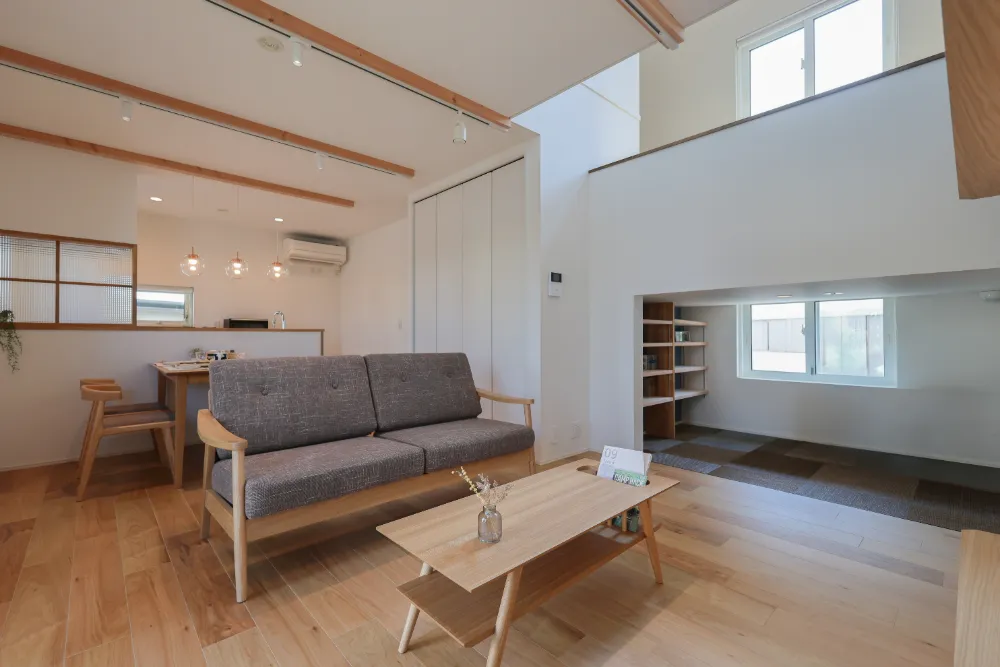ナチュラルな内装に包まれた吹抜けは、やわらかな光と開放感が広がる心地よい空間。木の温もりとともに、家族の気配がゆるやかにつながる、のびやかな暮らしを叶えます。