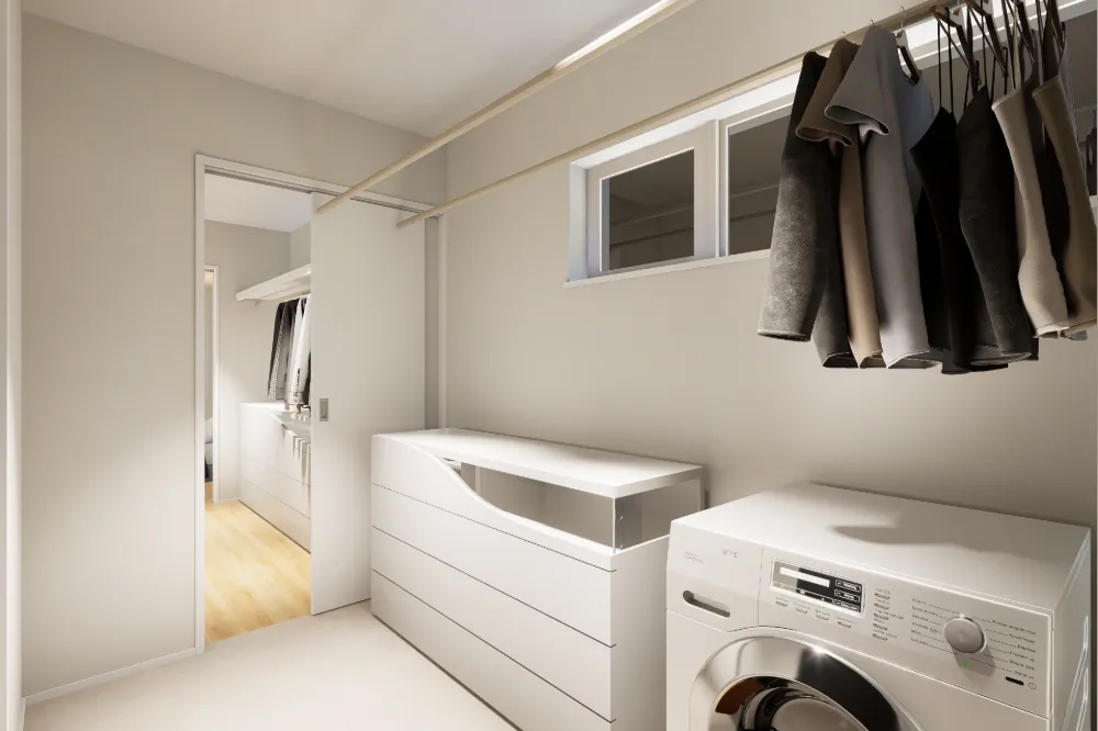 主寝室⇔ファミリークローク⇔サンルーム脱衣室が一直線で家事の効率化が図れます