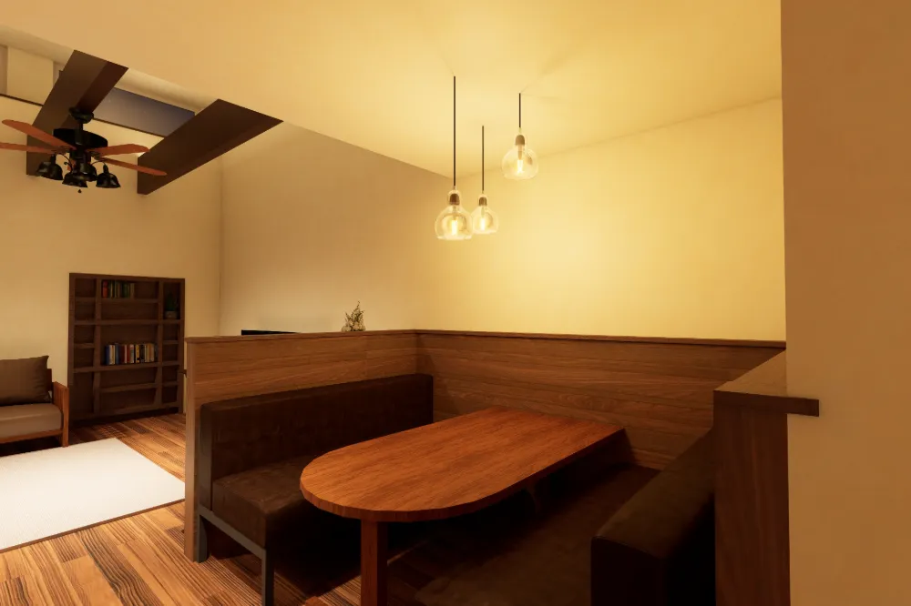 お気に入りのダイニングセットに、造作壁でほどよい個室感。 毎日の食事が、すてきなひとときになります。