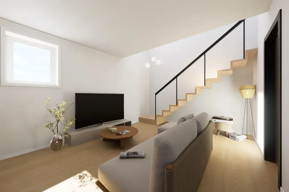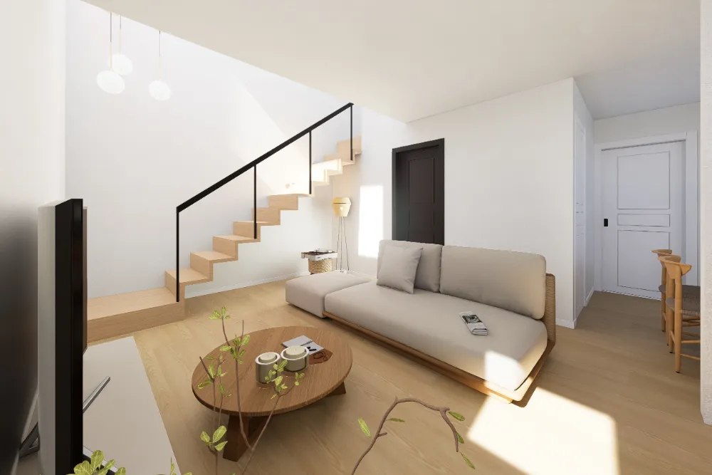 白を基調とした明るい空間に、木の質感を活かした階段が調和する内観。スケルトン階段が視線の抜けと開放感を生み、自然光がリビング全体に広がります。直線的でシンプルなデザインの中に、黒の手すりや建具が程よいアクセントとなり、洗練された暮らしを演出しています。
