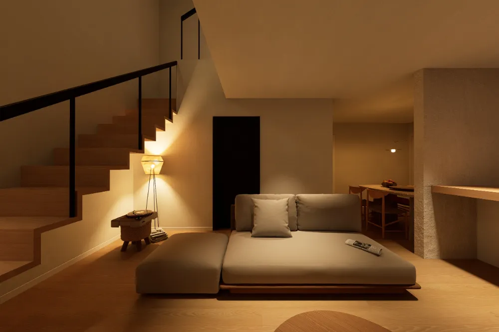 間接照明とペンダントライトがやさしく空間を包み込み、夜の時間を心地よく演出します。キッチンには造作カウンターを設置。昼は家族との自然な会話を楽しむ場所、夜はまるでプライベートバーのようにグラスを傾けながら本を読んだり心地よい静けさの中でひと息つく、上質なひとときが広がります。