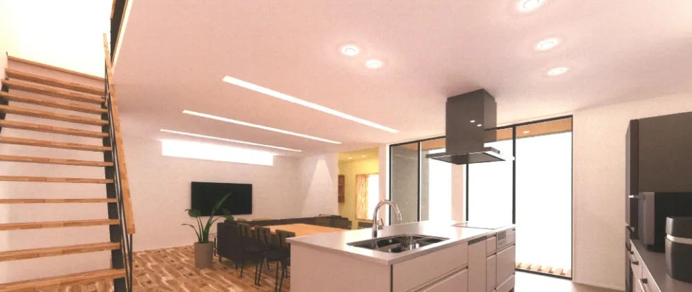 キッチン、ダイニング、リビング、そしてワークスペースまでが一体となった大空間。どこにいても家族とのつながりを感じることができます。