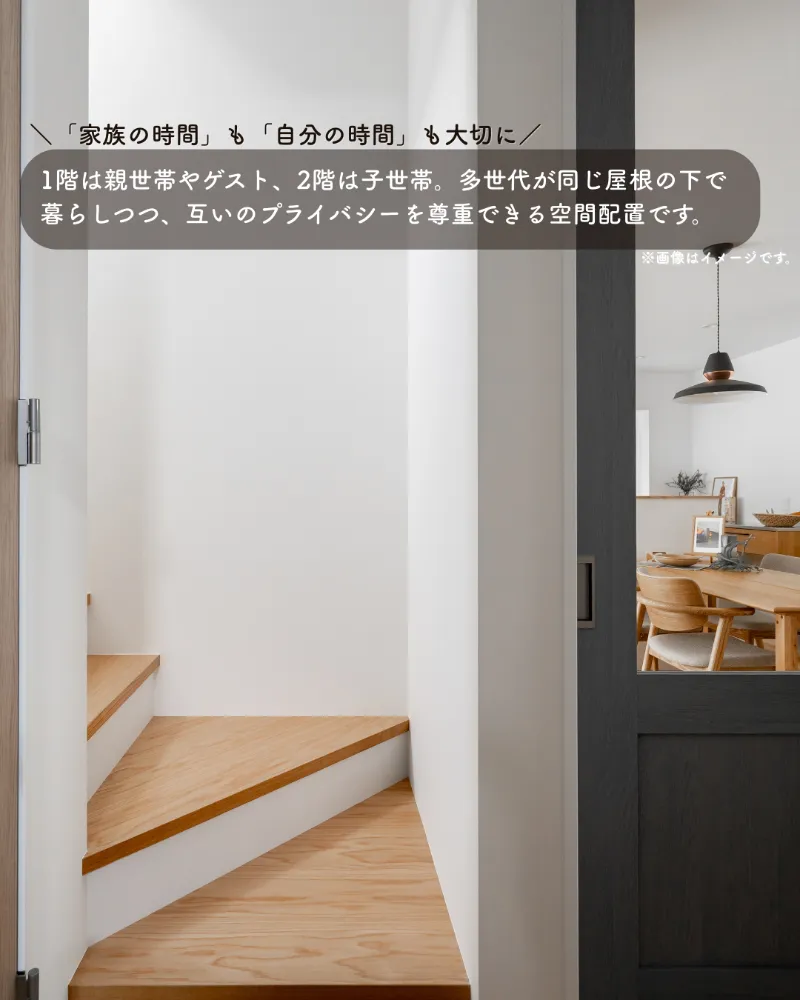 1階は親世帯やゲスト、2階は子世帯。同じ屋根の下で暮らしつつ、互いの時間を大切にできる工夫が詰まっています。