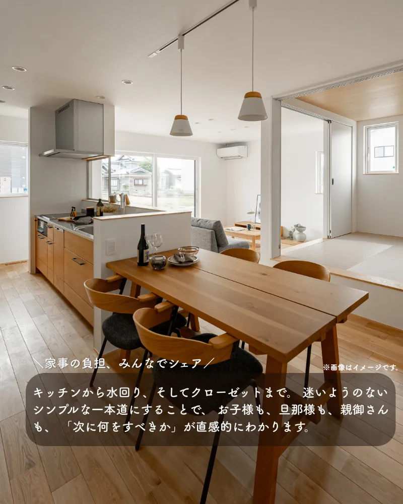 キッチンから水回り、クローゼットまでを一直線に。お子様もパパも「次に何をすべきか」が直感的にわかる、迷わない一本道動線です。