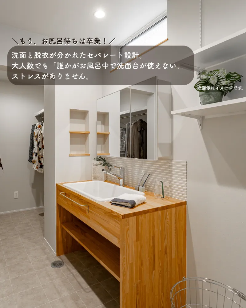 洗面と脱衣を分けたセパレート設計。誰かがお風呂に入っていても、気兼ねなく洗面台が使えます。