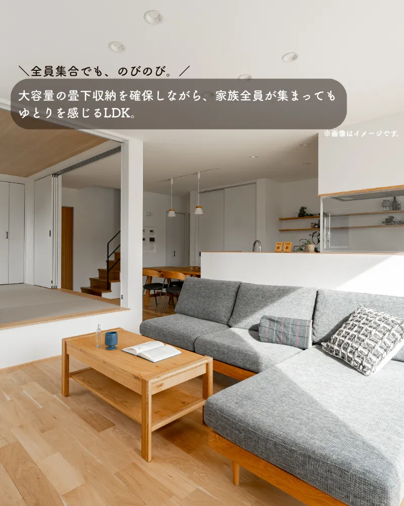 全員が集まってもゆとりを感じるLDK。畳下収納など、スッキリ暮らすためのアイデアも満載です。