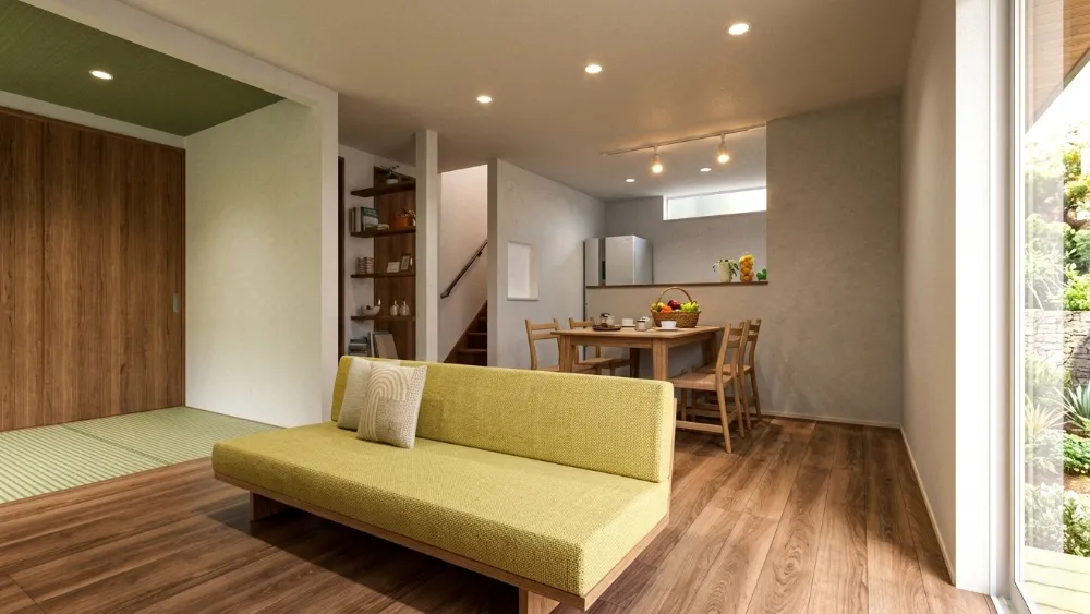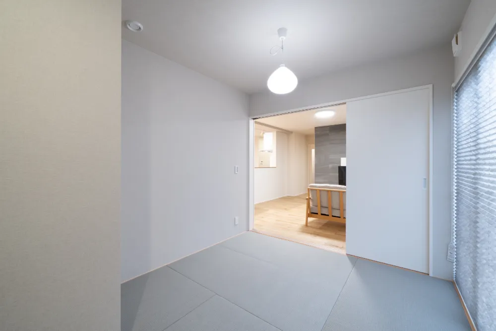 LDKの横には、家族の暮らしに合わせて使えるタタミコーナーを配置。 お子様の遊び場として使ったり、お昼寝スペースにしたり。 来客時には客間としても使える、暮らしに合わせて変化する便利な空間です。 窓から外の景色が見える設計もポイントです。