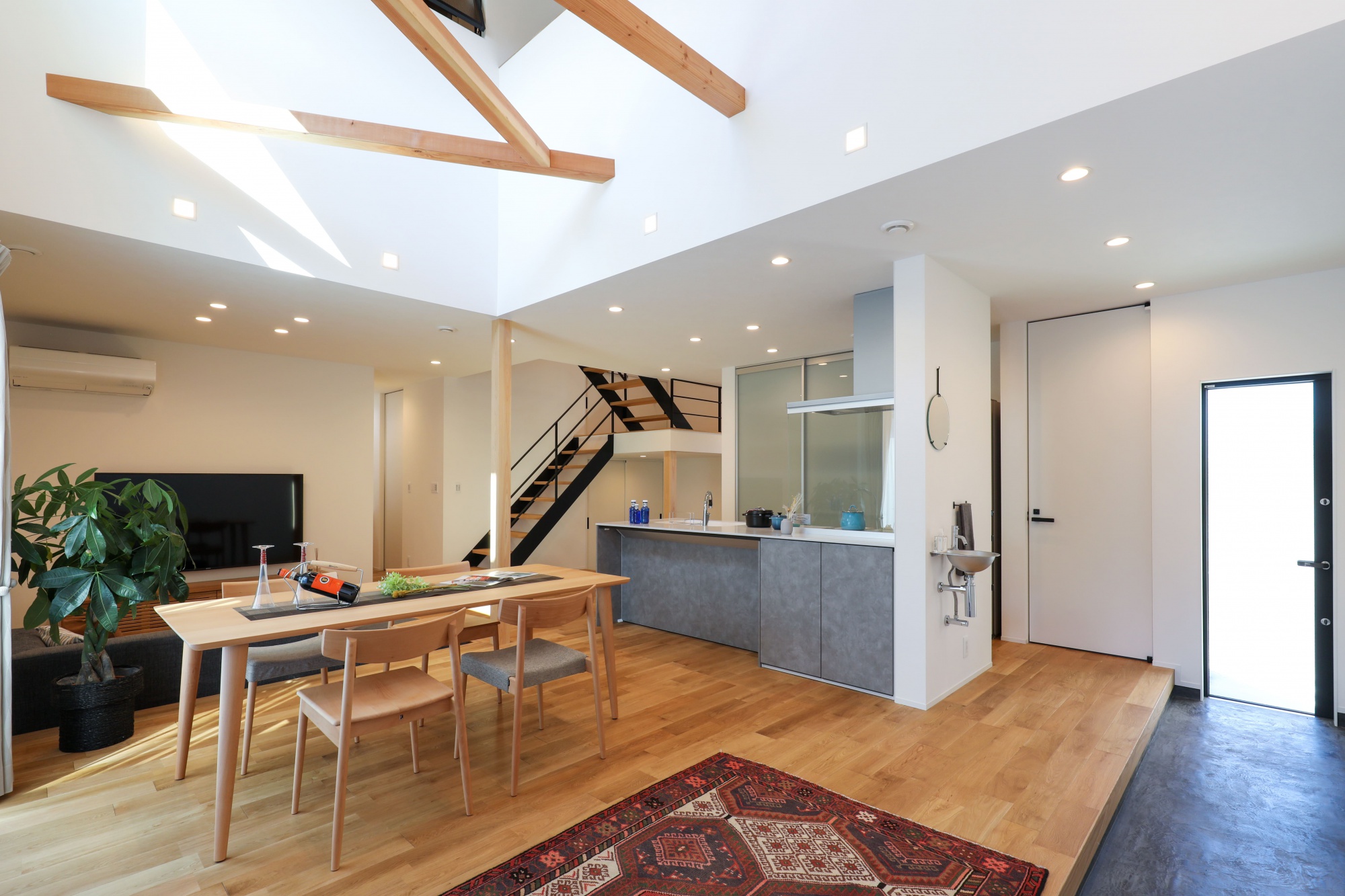 ダイニングキッチンまで一体化したリビング。 ゆったり広々した空間でも、エアコン一台で快適に過ごせます。 吹き抜けって暑い?と聞かれることが良くあります。 夏は、涼しい空気が2階からやさしく下りてきます。 家中どのお部屋でも温度差がほとんどなく快適なので、暑い夏の日は、帰宅されるたび、お家の快適さに満足しているとお声を頂いております。