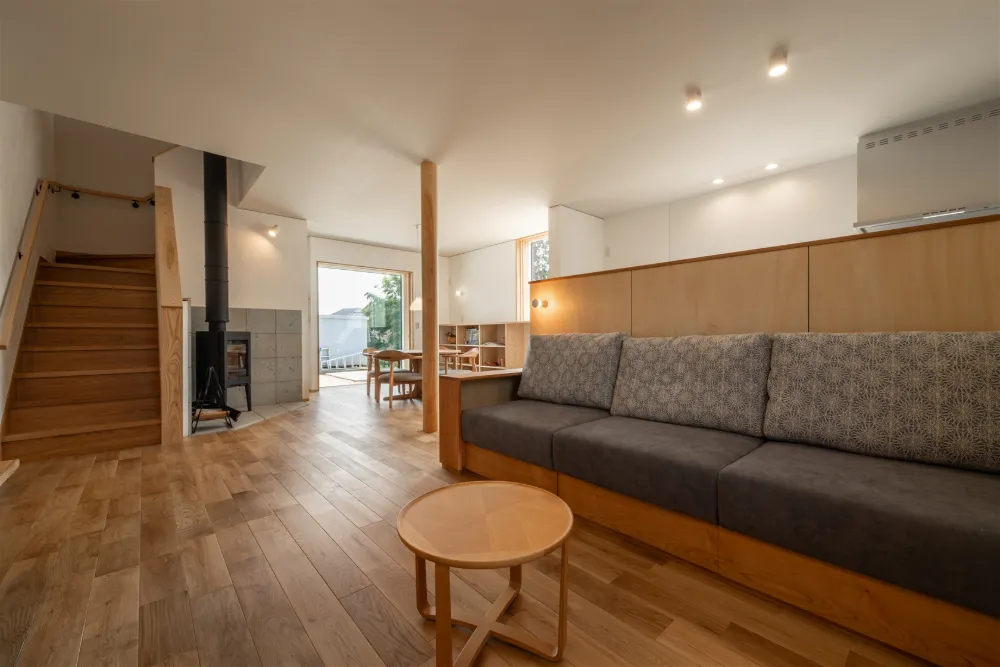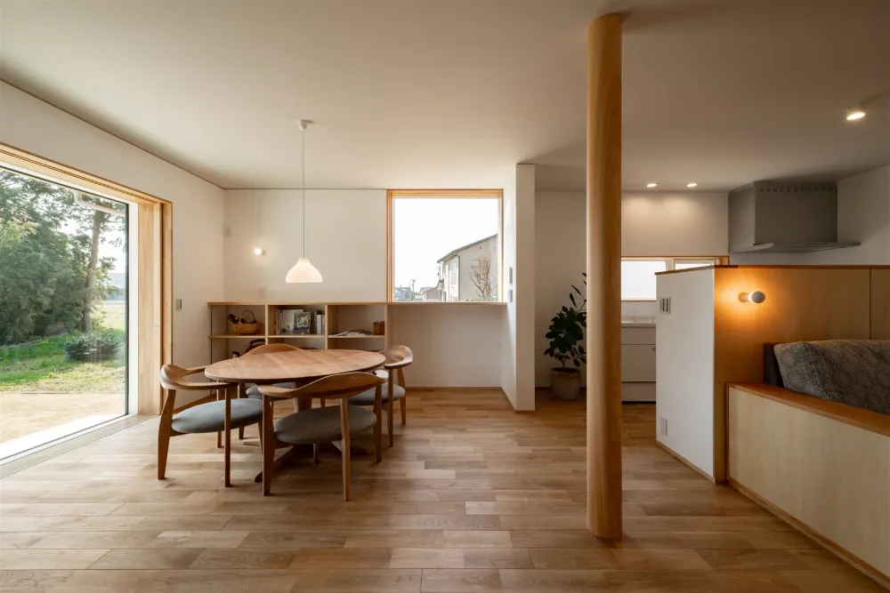 大きな窓から光が差し込むダイニング、無垢材としっくいに包まれる空間など、日々の暮らしを心地よく整える工夫が詰まっています。