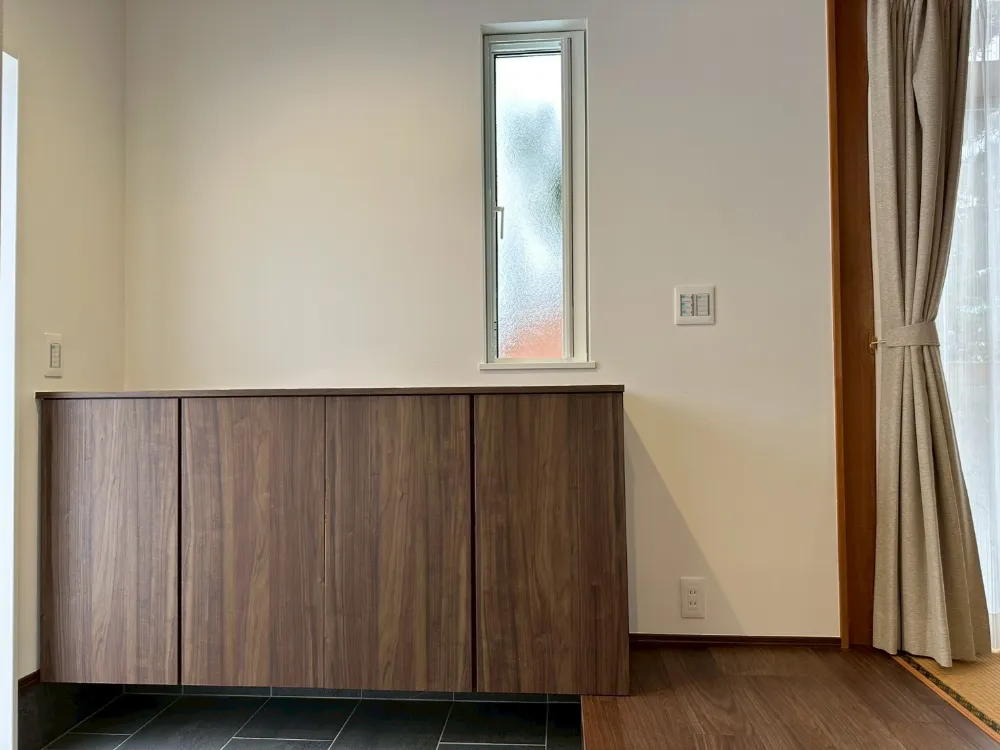 珪藻土の塗り壁と造り付けのTVボードが調和し、上質で自然な空間を演出
