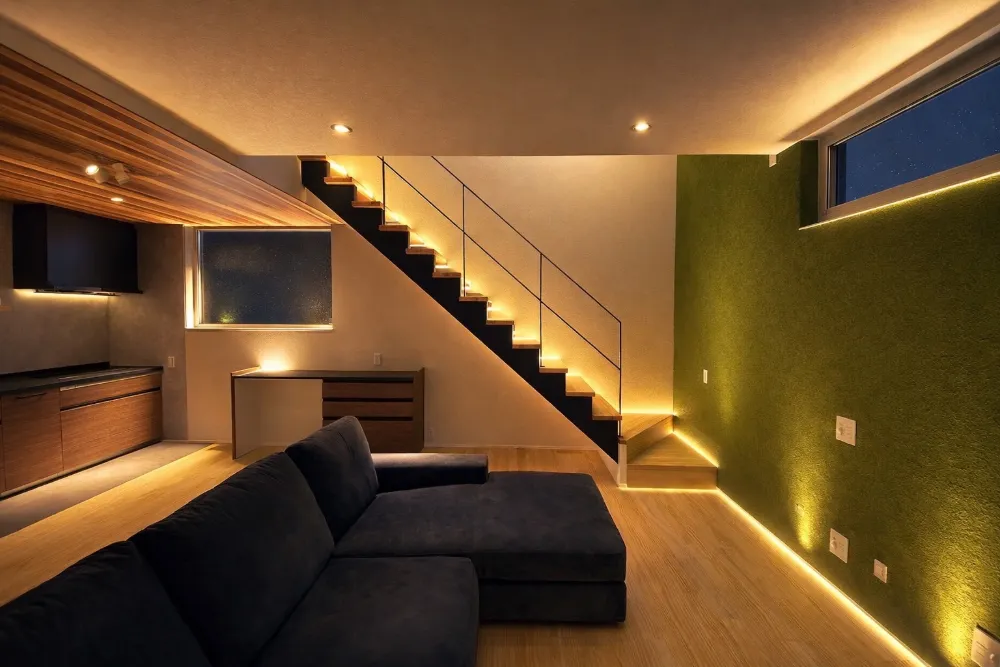外観はシャープなフォルムとモノトーンでまとめ、街並みに映える存在感を演出。 畳スペースには縦格子と飾り棚を設け、和の落ち着きと現代的な美しさを両立。 リビング階段には光を仕込み、夜にはホテルのような上質な雰囲気が広がります。