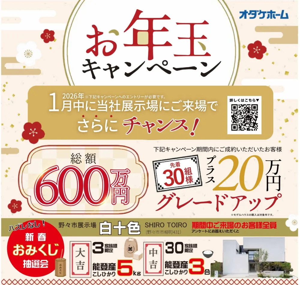 「白十色 SHIRO TOIRO」にご来場で、下記マイホームスタートキャンペーンにプラスして20万円のグレードアップをサービスいたします!! さらに、ハズレなしの”新春おみくじ抽選会”を開催いたします! 商品は「能登産こしひかり🍚」。 大吉を引き当てた方には、5Kgをプレゼント!中吉でも3合をプレゼントいたします!