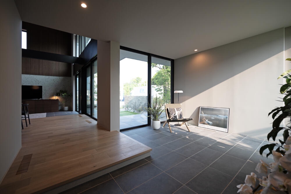 リビングと外のテラスをつなぐタイルは同じものを採用。「内と外の境界をなくすデザイン」で、自然と一緒に暮らしているような気分になれるのが魅力的な空間。
