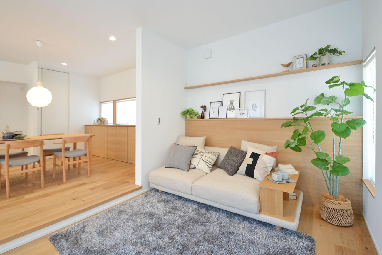 一段下がったリビングスペースは、空間にリズムが生まれ、落ち着いた雰囲気を演出してくれます。 子どもの遊び場としても、夜のくつろぎ時間にもぴったり。来客時には、特別感のあるもてなし空間に早変わり。