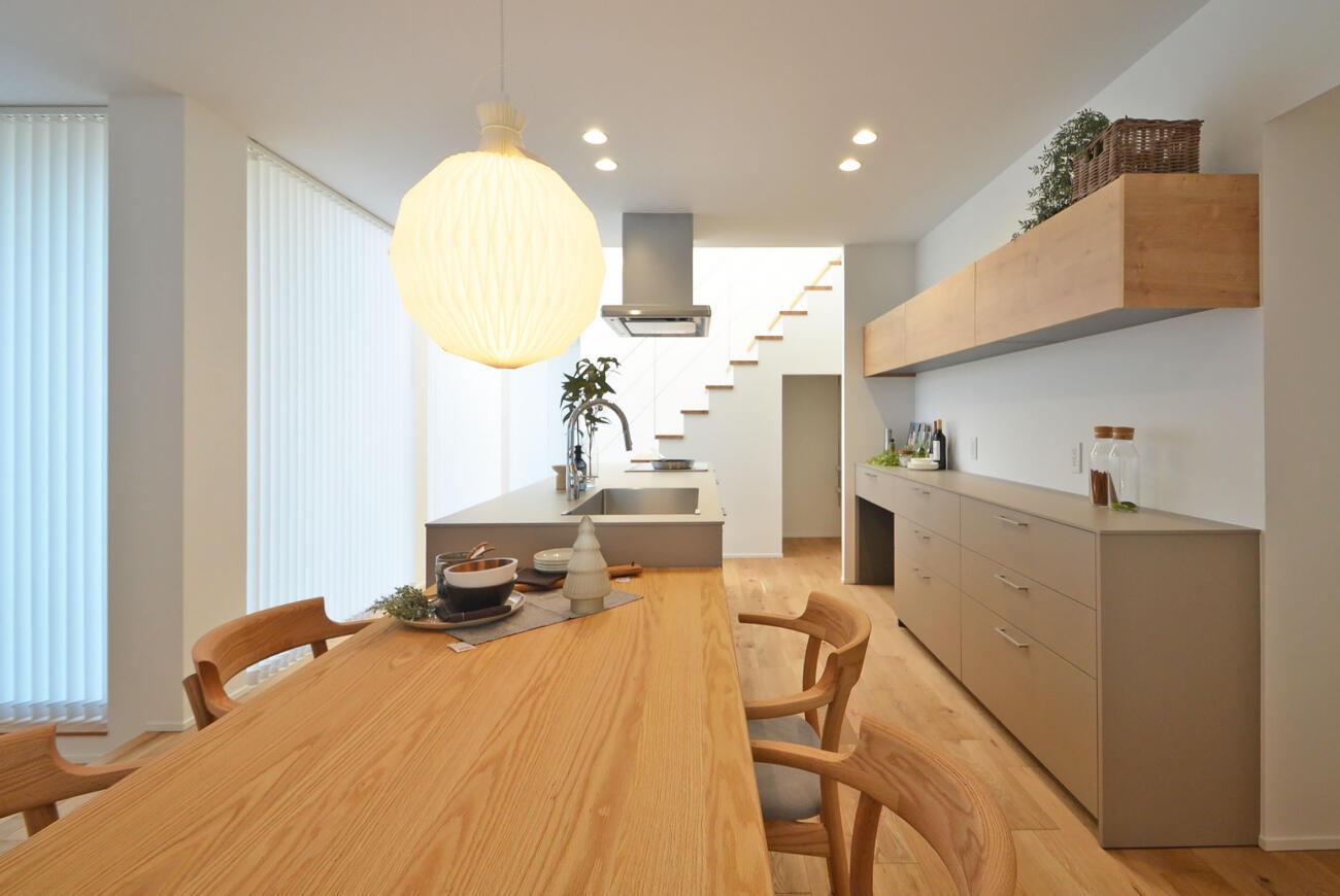 キッチンとカップボードはGRAFTEKTのアイランドを採用。高級感のある上質なLDKを彩ります。 木や白を多く採用し、すっきりシンプルにまとめ、家具が映えるようにしました。