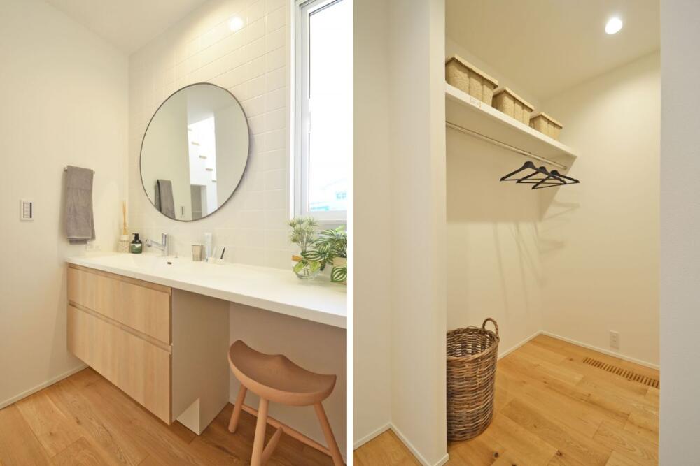 W.I.C・洗面・ランドリールームが一直線につながった動線設計。 キッチンからも近く、料理をしながら洗濯、身支度をしながら片付け…と、家事の同時進行がしやすい間取り。共働きや子育て世代にこそ実感してほしい、“手間の少ない家” です。