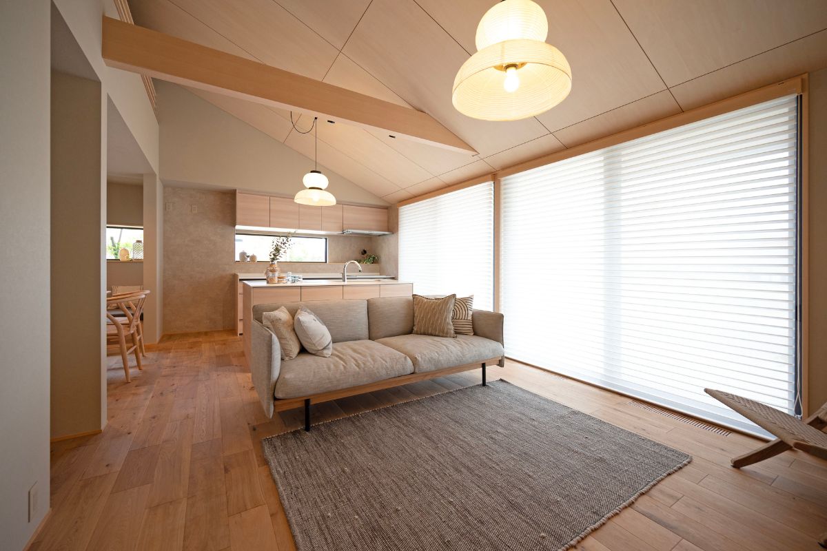 平屋ならではのワンフロアの暮らしやすさに加え、勾配天井がもたらす20帖のLDK。 家族の気配を感じながらも、それぞれが心地よく過ごせる開放的な空間。