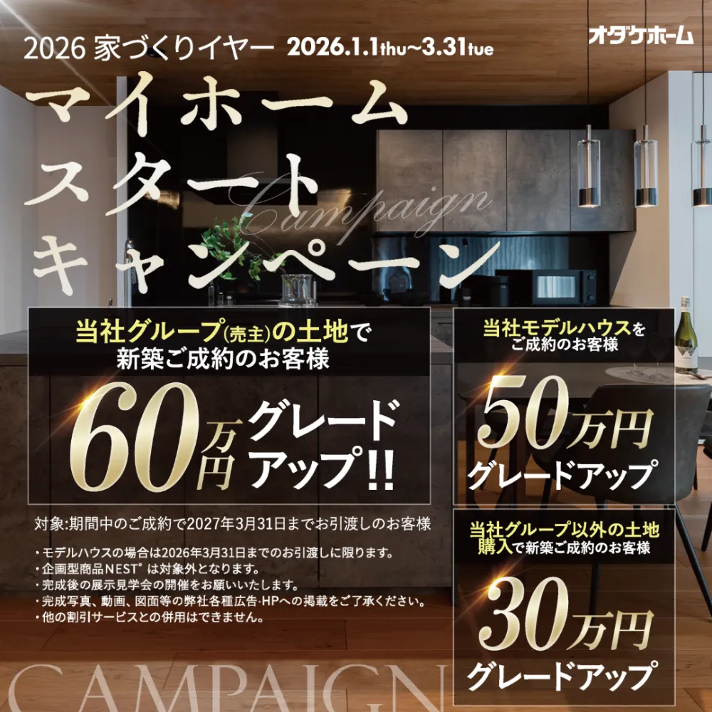 今なら3月末までにお引渡し可能な方に50万円分のグレードアップ工事費をプレゼント!詳細はお問い合わせください。